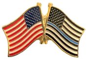 Police Memorial flag friendship lapel pin depicts the US flag on the left along with the Police Memorial flag on the right. Each pin measures approximately 1" x 3/4" or 28 mm x 18.3 mm and is the same quality as the single flag lapel pins.