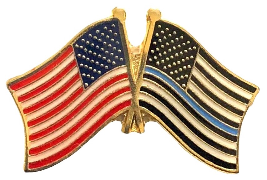 Police Memorial flag friendship lapel pin depicts the US flag on the left along with the Police Memorial flag on the right. Each pin measures approximately 1" x 3/4" or 28 mm x 18.3 mm and is the same quality as the single flag lapel pins.