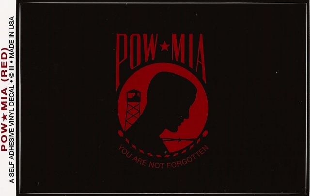 These waterproof POW MIA (Red) vinyl flag decal stickers are perfect for attaching to your car window, bumper or any flat surface. These decals are available in 3 1/2" x 5" and have the adhesive on the back of the decal. Quantity discounts available if you order 6 or more.