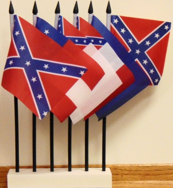 This Polyester Miniature Historical Confederate set contains (6) flags consisting of the Confederate Rebel flag, 1st Confederate flag, 2nd Confederate flag, 3rd Confederate flag, Bonnie Blue flag and the Square Battle flag. Each flag measures 4" x 6" except the Square Battle Flag which measures 4" x 4" and each flag is attached to a 10" black plastic staff with a black spear top. This set also includes a 6" x 2.5" inch white handcrafted (6) hole base and is designed to present these historical flags.