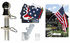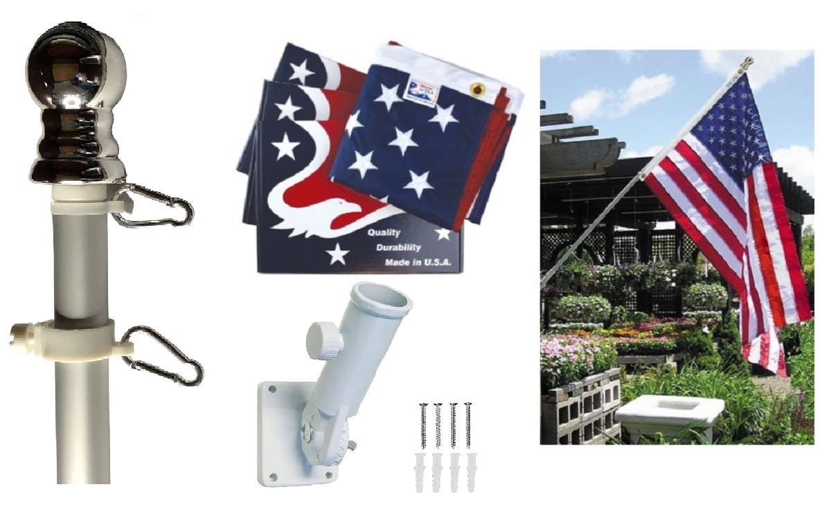 The deluxe flag pole kit includes the 2x3 nylon embroidered outdoor American flag Made in USA, a 4' rotating 1 inch diameter silver aluminum spinner pole with matching silver top and a white steel multi position mounting bracket.