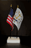 This high quality State and US miniature flag desk set is perfect for office, classroom and table decorations. Flags are made of silk-like rayon, measure 4"x6" and are attached to 10" black plastic staff with a gold spear top. All edges are hem stitched. Flag stand measures 4" long, 2.5" wide and stands .75" high.