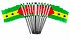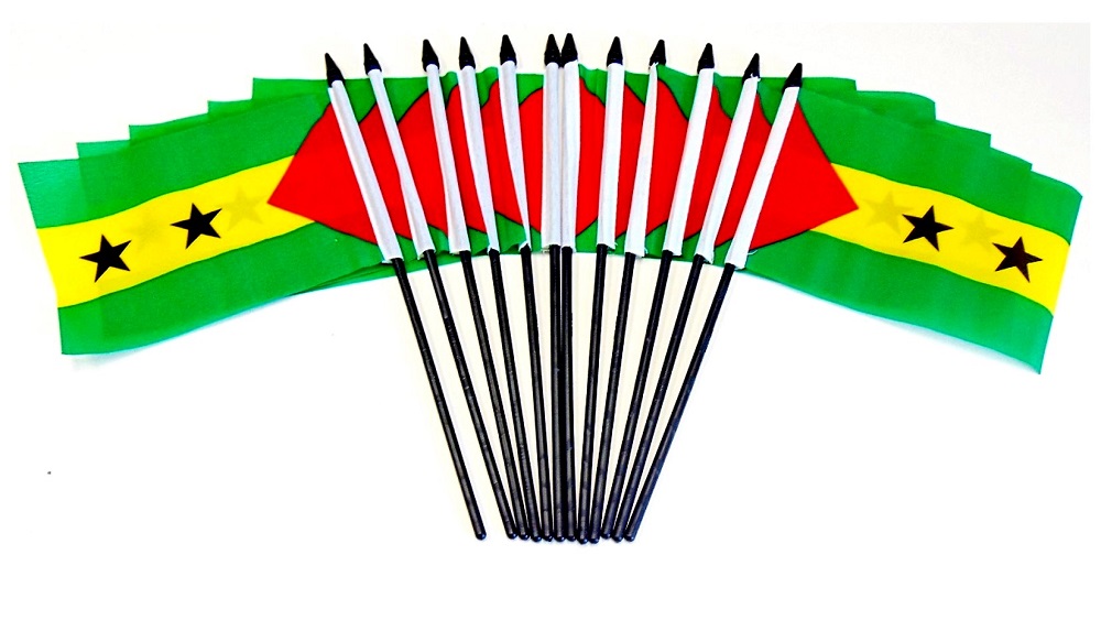 These Sao Tome polyester table flags are great for special events, parades and party decorations. They are priced less than the top quality rayon desk flags and are sold only in packs of 12 per order unit. Each Sao Tome miniature flag measures 4″x6″ and is attached with a pole hem to a 10″ black plastic staff with a black spear top.