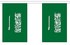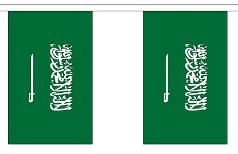 Saudi Arabian string flag bunting is available in two sizes, 10′ string with 10 6″x9″ polyester flags or 30′ string with 30 6″x9″ polyester flags. Several 10′ sections can be tied together for a longer length and the 30′ strings can be cut to fit the size that you need in the space available.
