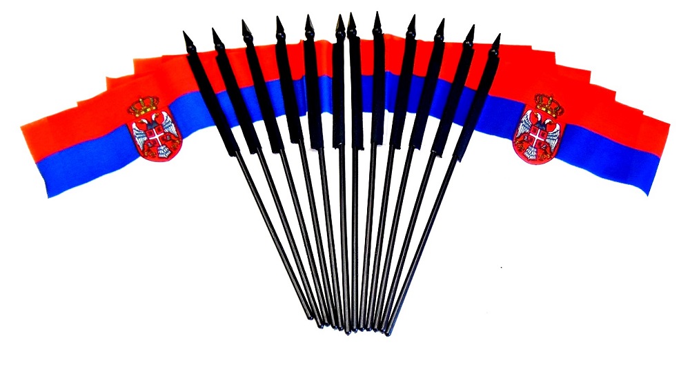 Each flag measures 4″x6″ and is attached to a 10″ black plastic staff with black or gold spear top. Excellent low price alternative for special events, parades, or table decorations.
