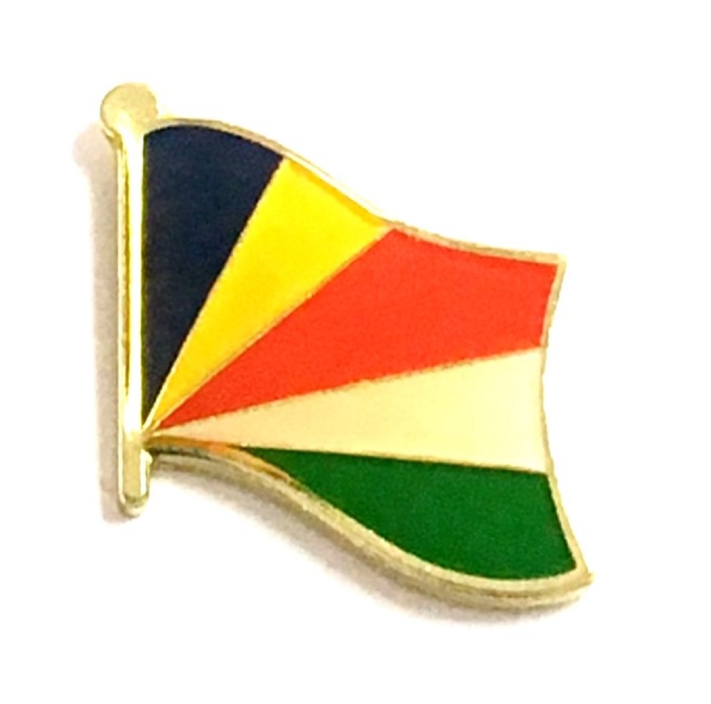 Seychelles flag pin measures approximately 1 inch; x 3/4 inch; or 24 mm x 16 mm and has an all metal lacquered design with clutch pin.