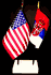 Elevate your workspace with our Serbia and American miniature flag desk set! These silk-like rayon flags, measuring 4"x6", are attached to a 10" black plastic staff and finished with a gold spear top. Perfect for office, classroom, or table decor. Each set comes with a 4" long white flag stand for added display options.