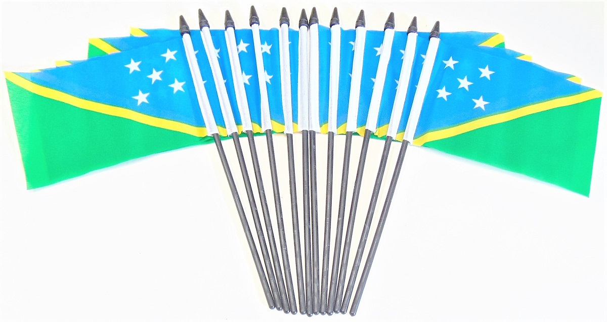 Each Solomon Islands mini flag measures 4″x6″ and is attached with a pole hem to a 10″ black plastic staff with a black or gold spear top.