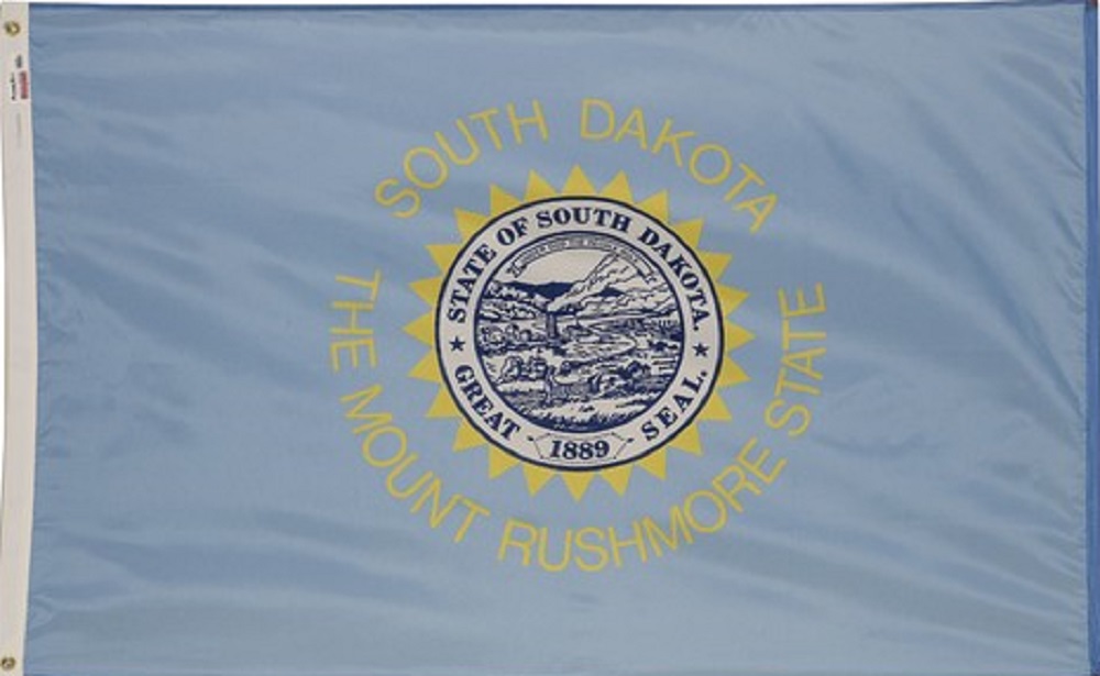 Unsurpassed in elegance and craftmanship, these 3'x5' acid dyed South Dakota state flags are made to precise specifications. Intricate emblems are produced with exactness in fast, brilliant colors. Each flag is individually boxed and made in the USA. These outdoor display flags are offered in 100% lustrous nylon. Flags are finished with canvas heading and brass grommets.