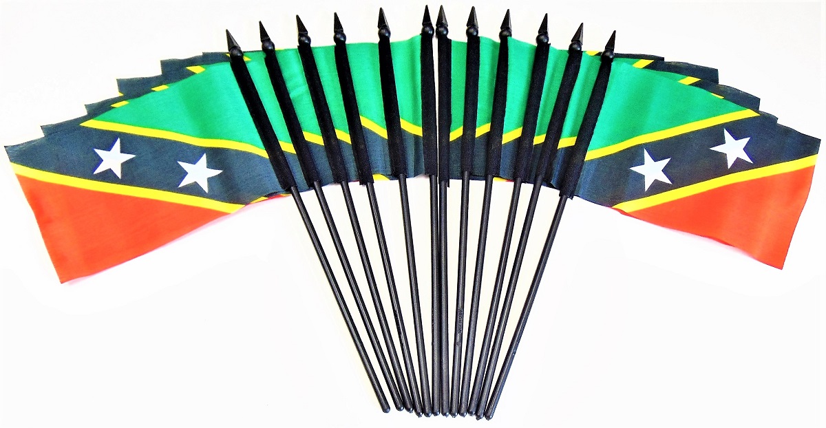 These St. Kitts polyester table flags are great for special events, parades and party decorations. They are priced less than the top quality rayon desk flags and are sold only in packs of 12 per order unit. Each St. Kitts miniature flag measures 4″x6″ and is attached with a pole hem to a 10″ black plastic staff with a black spear top.