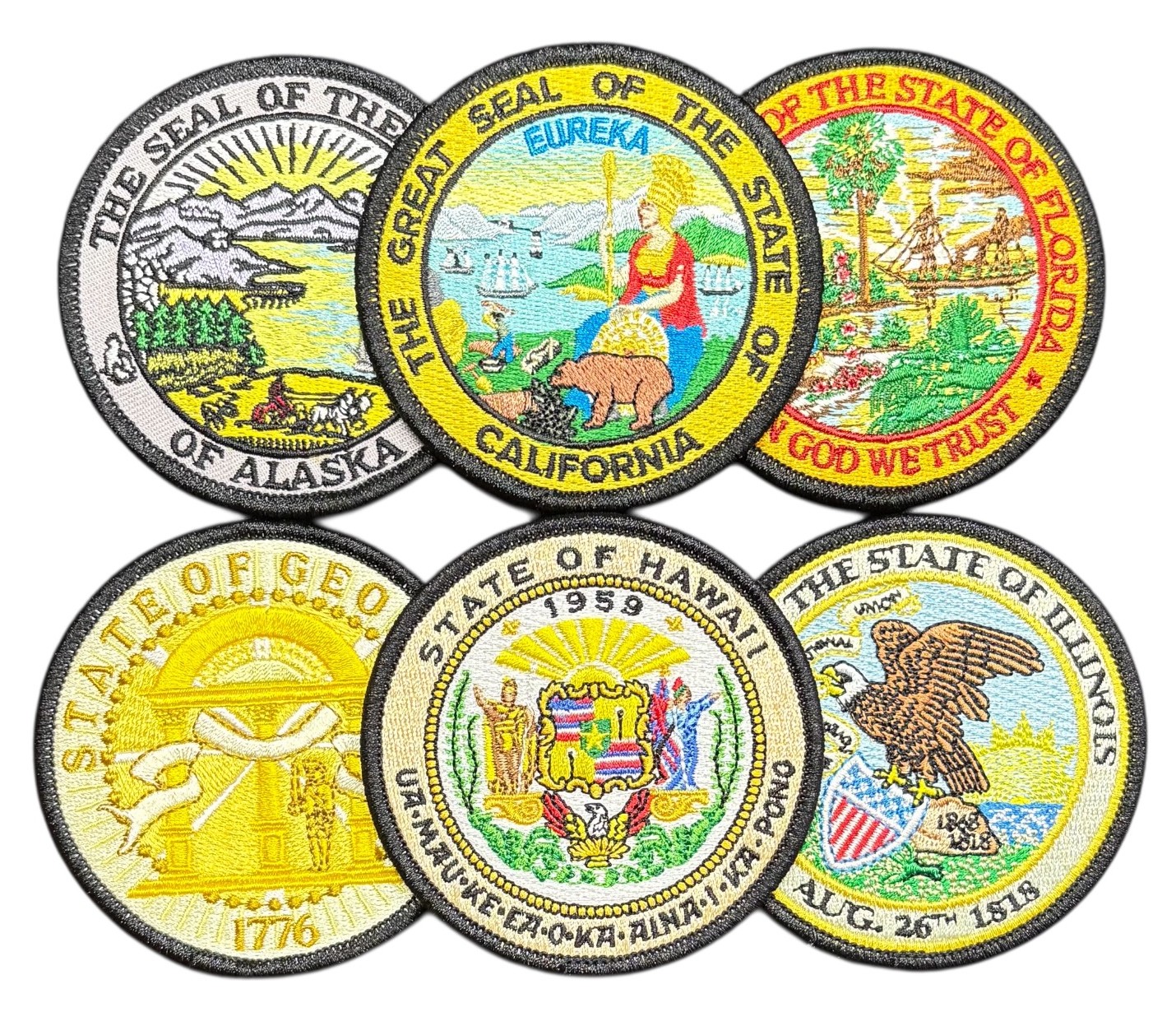 State seal patches are embroidered and measure 3″ in diameter. Each patch can be ironed on or sewn on.