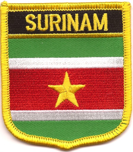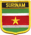 Suriname flag shield patches are fully embroidered and measure 2.25″ x 2.5″. Each patch is trimmed in gold and can be ironed or sewn on.