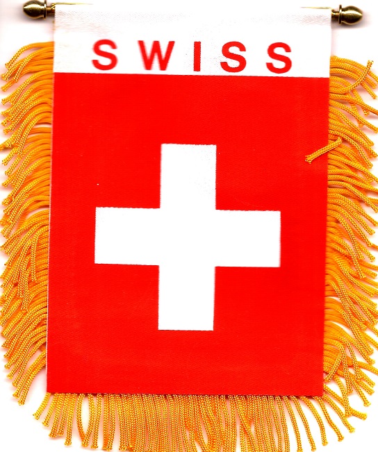 Switzerland car windshield, window or mirror mini banner flags measure 3 1/2" x 5" and are great ways to show your heritage. Each flag has a gold fringe with a string for hanging over your car mirror, and a suction cup.