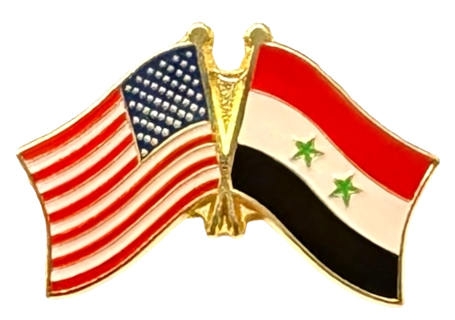 Each Syria flag friendship lapel pin depicts the US flag on the left along with the Syria flag on the right. Each pin measures.approximately 1" x 3/4" or 28 mm x 18.3 mm and is the same quality as the single flag lapel pins.