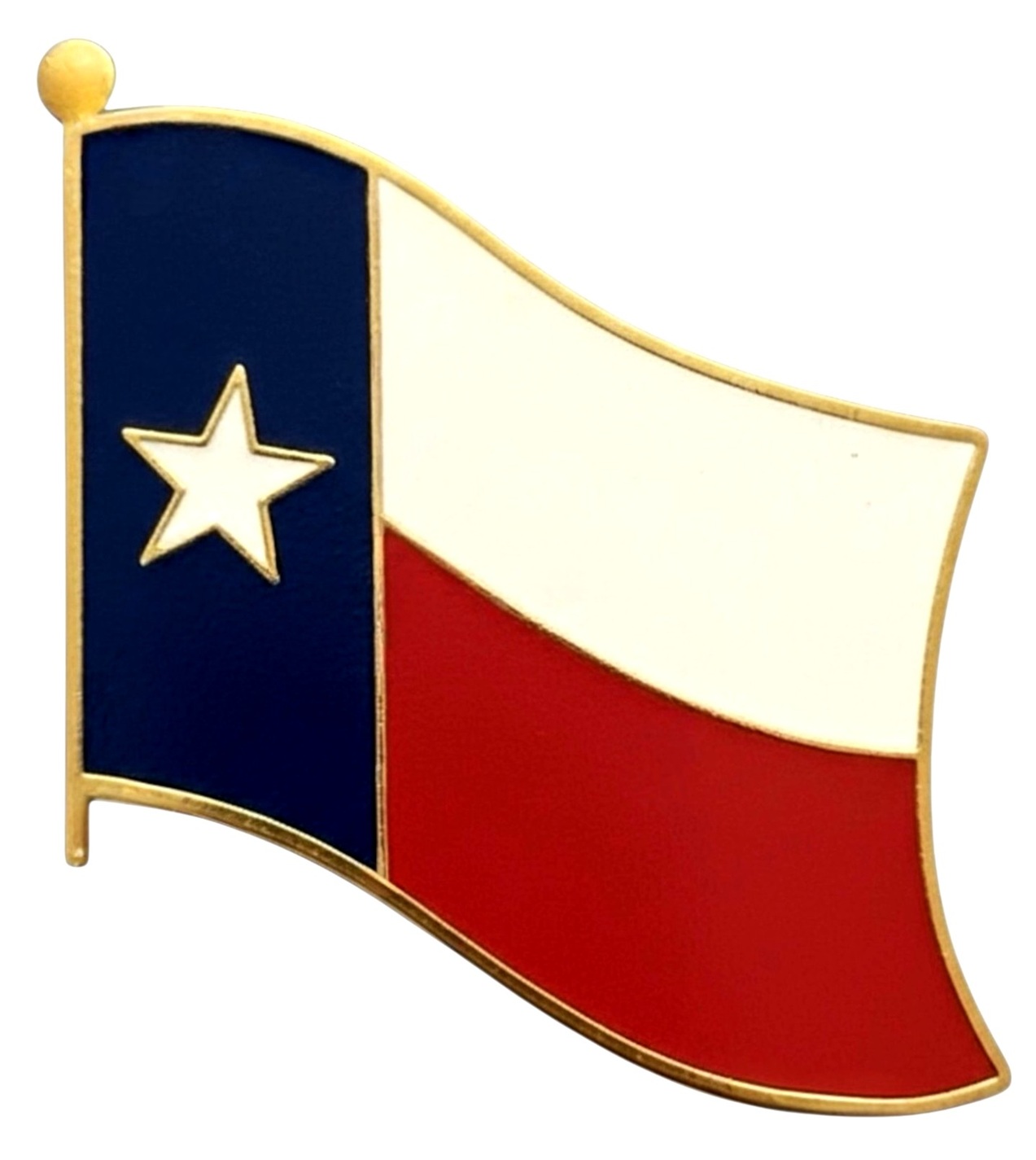 Texas single flag lapel pins depict one waving flag. Each Texas flag pin measures approximately 1" x 3/4" or 24 mm x 16 mm and has an all metal lacquered design with clutch pin.