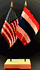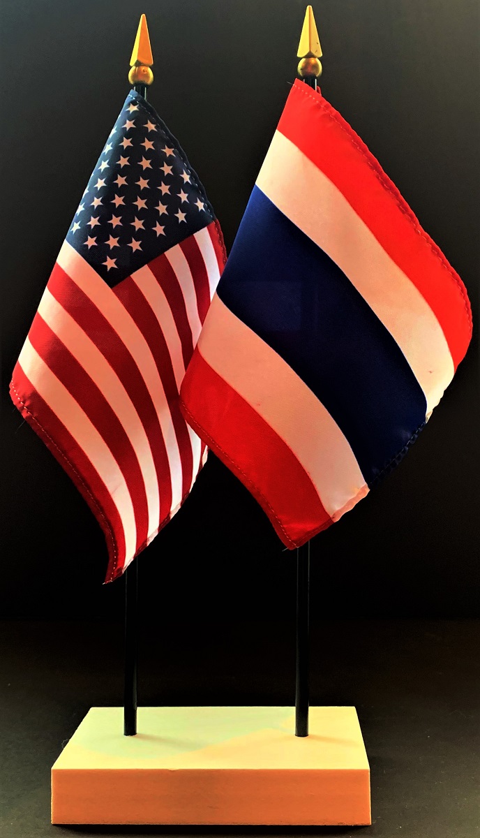 Elevate your workspace with our Thailand and American miniature flag desk set! These silk-like rayon flags, measuring 4"x6", are attached to a 10" black plastic staff and finished with a gold spear top. Perfect for office, classroom, or table decor. Each set comes with a 4" long white flag stand for added display options.