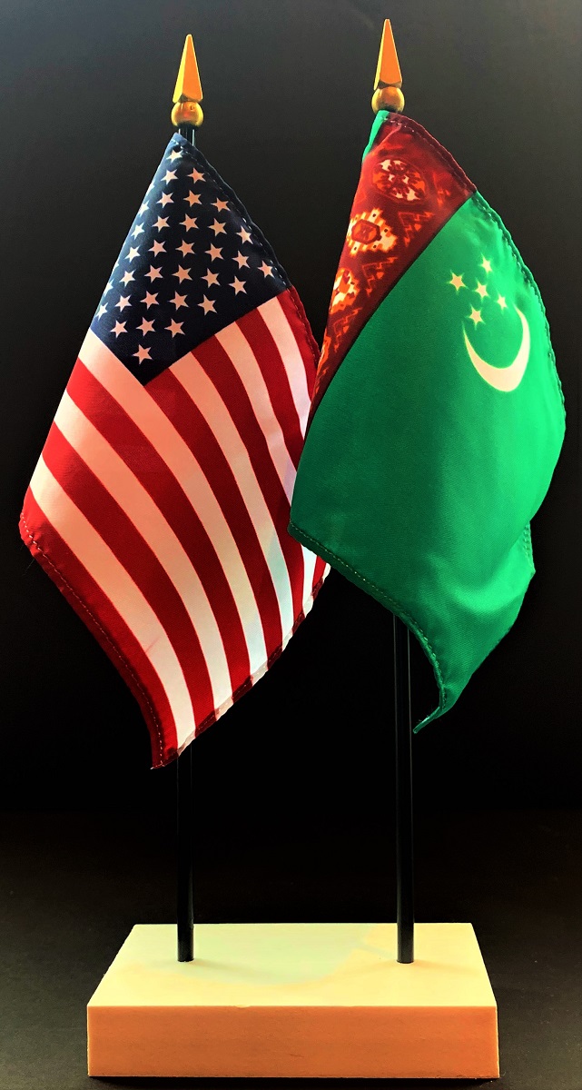 Elevate your workspace with our Turkmenistan and American miniature flag desk set! These silk-like rayon flags, measuring 4"x6", are attached to a 10" black plastic staff and finished with a gold spear top. Perfect for office, classroom, or table decor. Each set comes with a 4" long white flag stand for added display options.