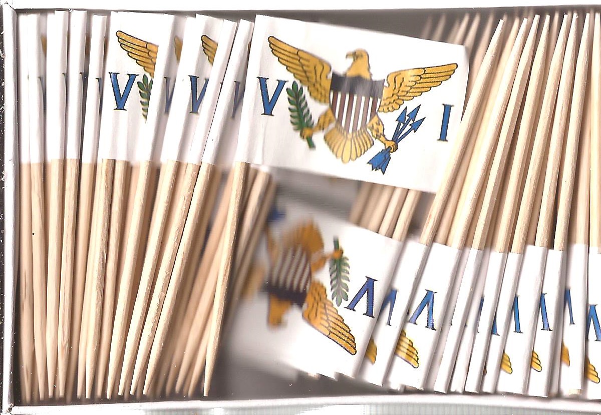 Miniature US Virgin Islands flag toothpick flags make great party and dinner decorations. Each box has 100 flag toothpicks. Each miniature flag is approximately 1″ x 1 1/2″ mounted on a 2 1/2″ toothpick.