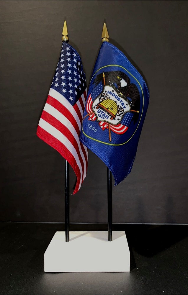 This high quality State and US miniature flag desk set is perfect for office, classroom and table decorations. Flags are made of silk-like rayon, measure 4"x6" and are attached to 10" black plastic staff with a gold spear top. All edges are hem stitched. Flag stand measures 4" long, 2.5" wide and stands .75" high.