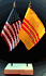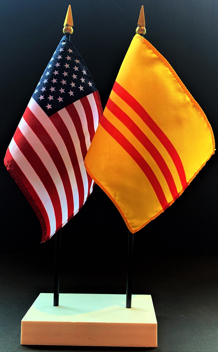 Elevate your workspace with our South Vietnam and American miniature flag desk set! These silk-like rayon flags, measuring 4"x6", are attached to a 10" black plastic staff and finished with a gold spear top. Perfect for office, classroom, or table decor. Each set comes with a 4" long white flag stand for added display options.