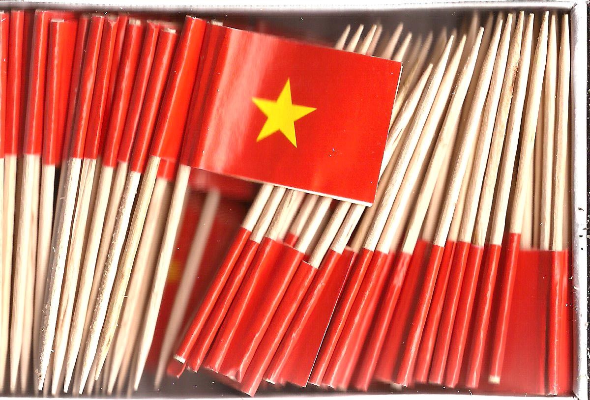 Miniature Vietnam flag toothpick flags make great party and dinner decorations. Each box has 100 flag toothpicks. Each miniature flag is approximately 1″ x 1 1/2″ mounted on a 2 1/2″ toothpick.