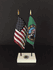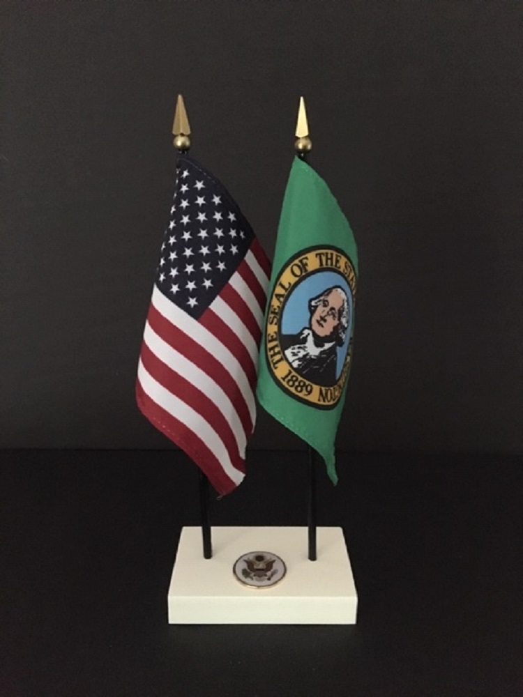 This high quality Washington and US Executive miniature flag desk set is perfect for office, classroom and table decorations. Flags are made of silk like rayon, measure 4"x6" and are attached to 10 inch black plastic staff with a gold spear top. All edges are hem stitched