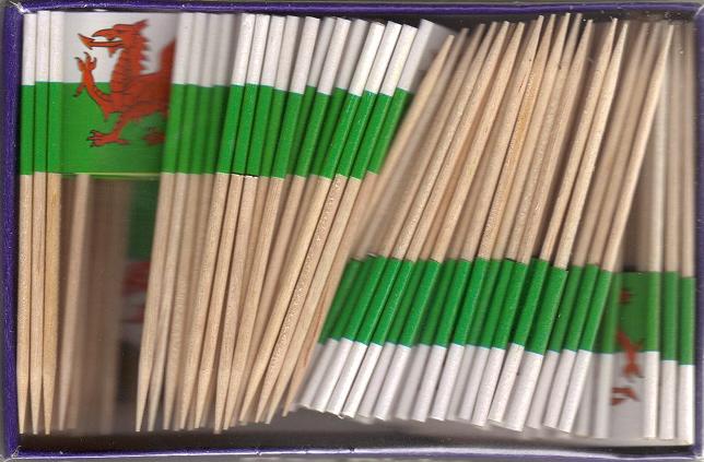 Miniature Wales flag toothpick flags make great party and dinner decorations. Each box has 100 flag toothpicks. Each miniature flag is approximately 1″ x 1 1/2″ mounted on a 2 1/2″ toothpick.