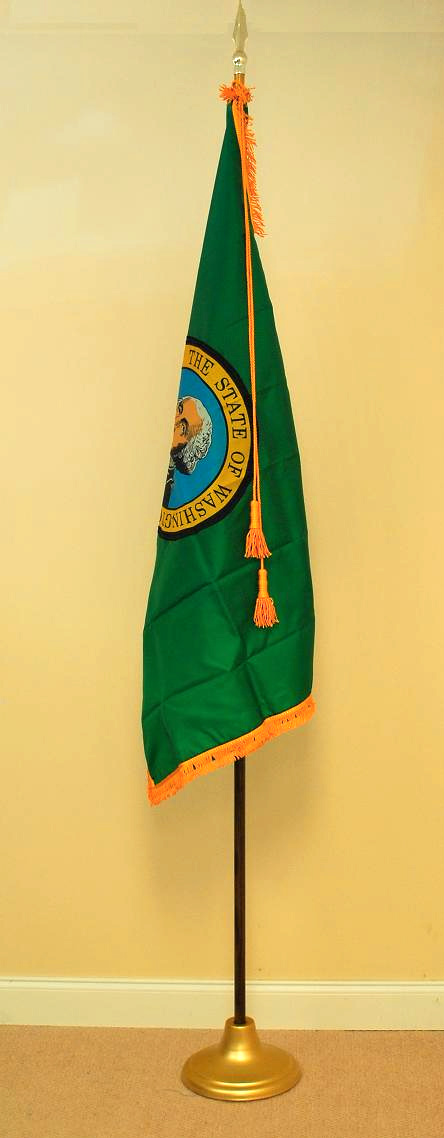 Click photo for larger image. Each State of Washington indoor flag set includes the 3'x5' gold fringed nylon Washington state flag with lined pole heading, leather tabs, cord and tassels, 8' polished oak pole with solid brass joint, heavy metal gold anodized stand, and gold plated 7 1/2" metal spear. (American Flag set sold separately).