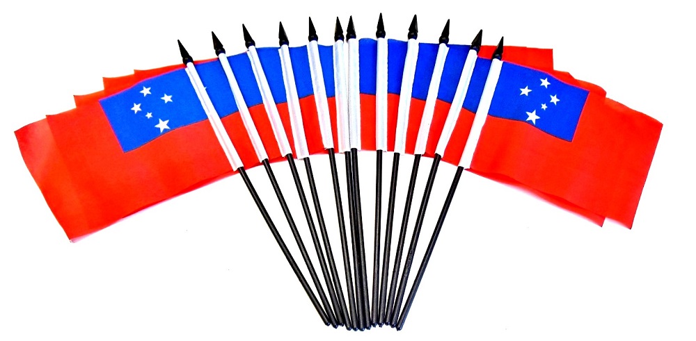 These Western Samoa polyester table flags are great for special events, parades and party decorations. They are priced less than the top quality rayon desk flags and are sold only in packs of 12 per order unit. Each Western Samoa miniature flag measures 4″x6″ and is attached with a pole hem to a 10″ black plastic staff with a black spear top.
