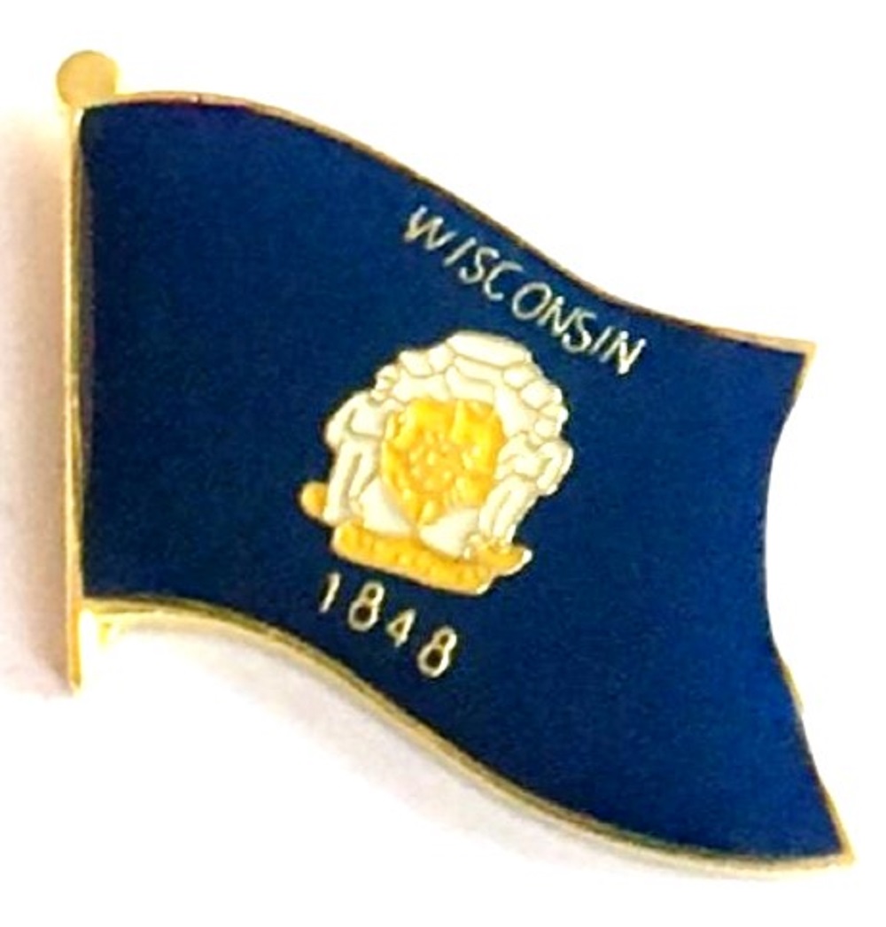 Wisconsin single flag lapel pins depict one waving flag. Each Wisconsin flag pin measures approximately 1" x 3/4" or 24 mm x 16 mm and has an all metal lacquered design with clutch pin.