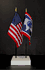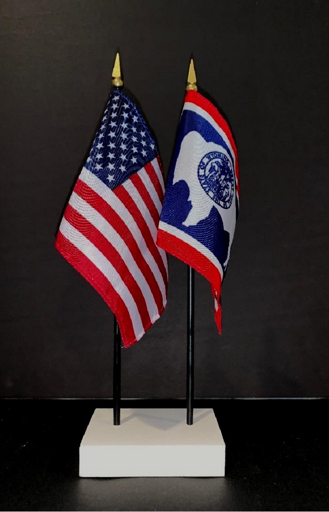 This high quality State and US miniature flag desk set is perfect for office, classroom and table decorations. Flags are made of silk-like rayon, measure 4"x6" and are attached to 10" black plastic staff with a gold spear top. All edges are hem stitched. Flag stand measures 4" long, 2.5" wide and stands .75" high.